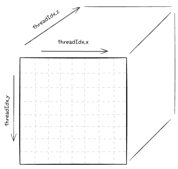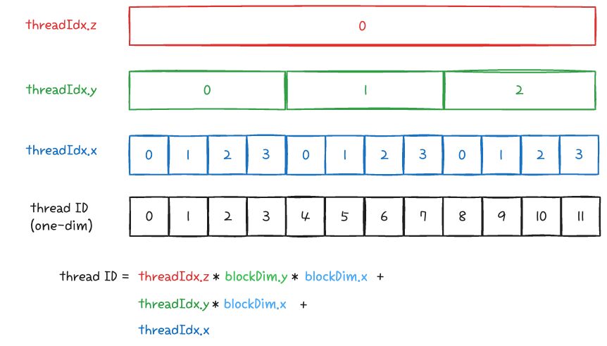 CUDA는 아래 그림과 같은 Grid - Block - Thread 의 논리적 계층구조를 사용한다. 블록 내부의 thread 는 3차원으로 구성할 수 있는데, 결론을 먼저 말하면 별다른 메모리 구조를 가지지 않는 한, 스레드 인덱스 (x, y, z) 는 (x + y Dx + z Dx Dy) 로 계산하라. 왜 그런지 알아보자.
