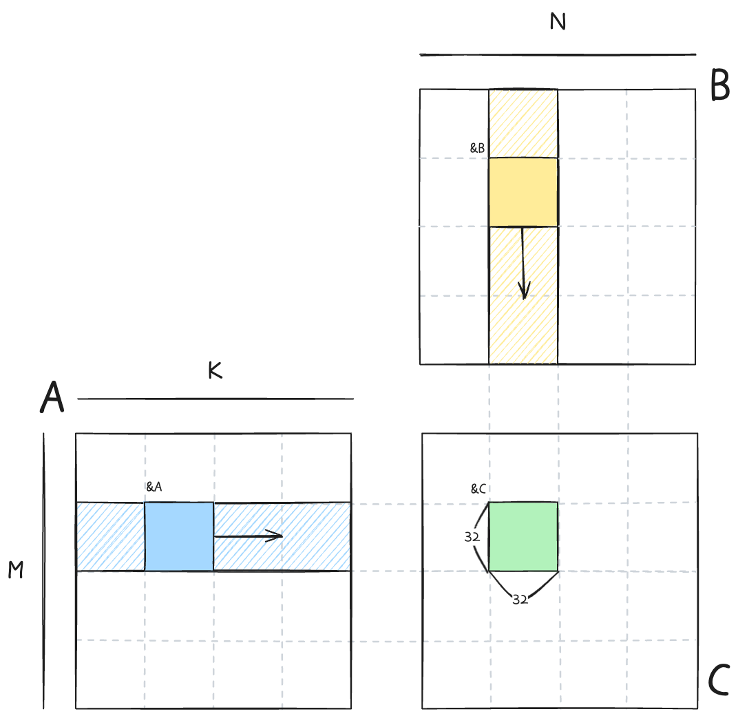 SRAM caching을 활용함으로써 성능이 향상되었지만 여전히 cuBLAS의 커널에 비해서는 부족하다. 단순하게 1개의 스레드가 1개의 결과를 만들어내는 SRAM caching 커널의 메모리 접근 패턴을 보면 다음과 같다. 즉, C 행렬 원소 한 개의 결과값을 만들기 위해서는 K/16 DRAM, K*2 SRAM 만큼의 메모리 접근이 필요한 것이다.