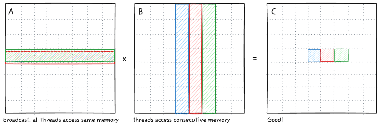 B를 load할 때는 모든 스레드가 같은 값에 접근하기 때문에 warp 내의 broadcast가 동작한다. 하지만 결과적으로 보면 이 스레드들을 하나의 워프로 묶는건 이점이 없다.