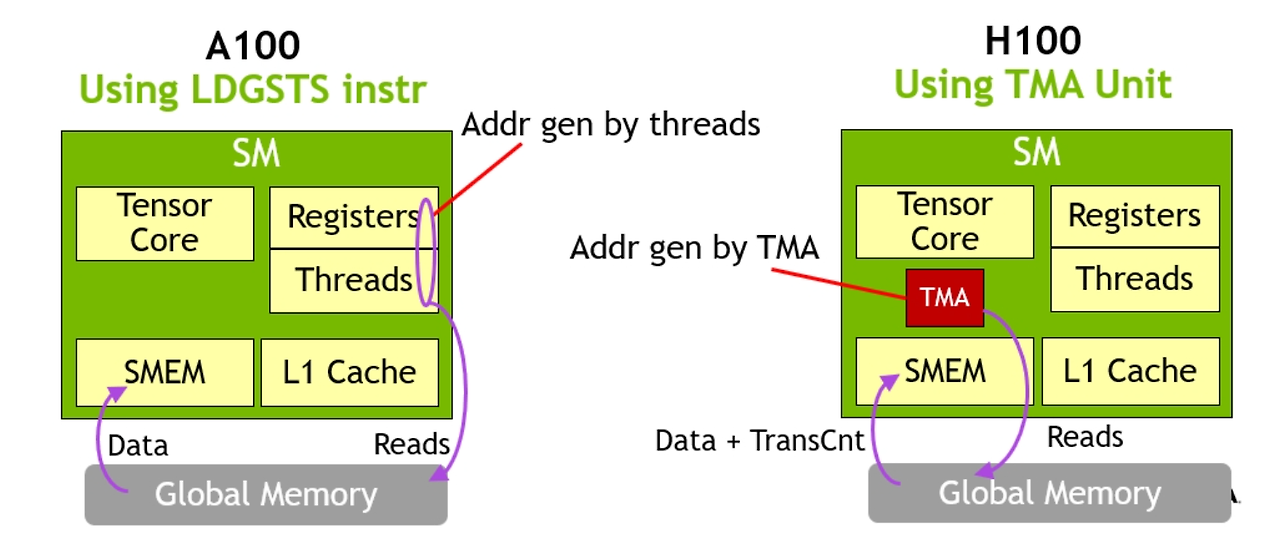 Ampere에서 L1 bypass를 통한 memory instruction의 성능 개선을 이루었다. 하지만 이를 위해서는 직접 메모리 주소와 stride 계산을 해주고 동기화에 관한 barrier까지 모두 관리해주어야했다. 그래서 NVIDIA는 여기에 만족하지 않고 TMA라는 유닛을 개발했다. TMA를 이용하면 텐서의 정보를 이용해서 대량의 데이터를 복사한다. 또한, 이 TMA instruction은 단일 스레드에서 launch되기 때문에 자원을 더욱 효율적으로 사용가능하다.