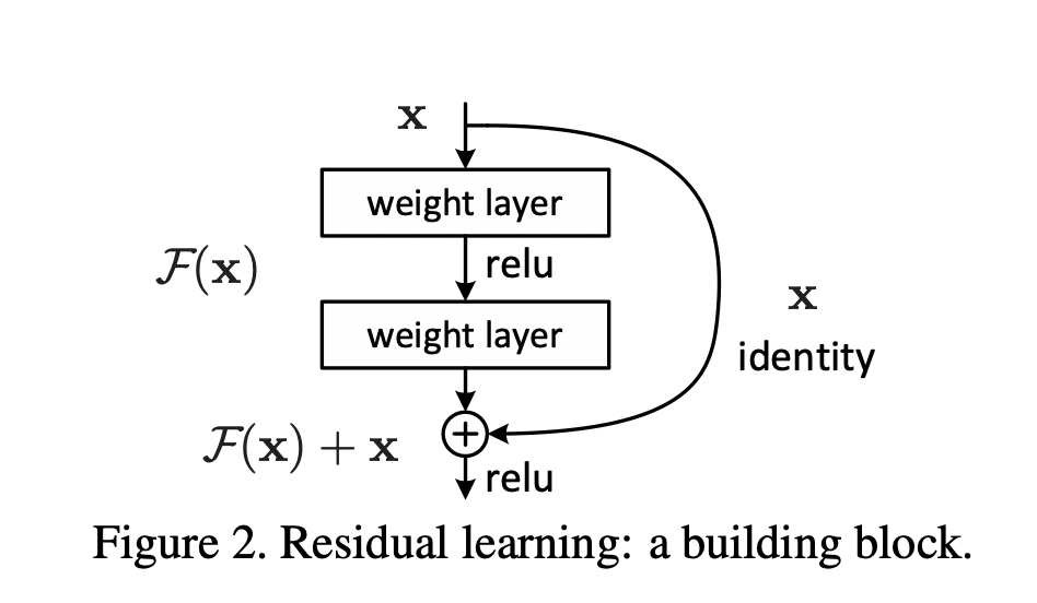 - 반면 ResNet 에서는 이를 $H(x)-x=F(x)$ 로 두고 $F(x)$ 를 최소화하는 것을 목표로 최적화를 함