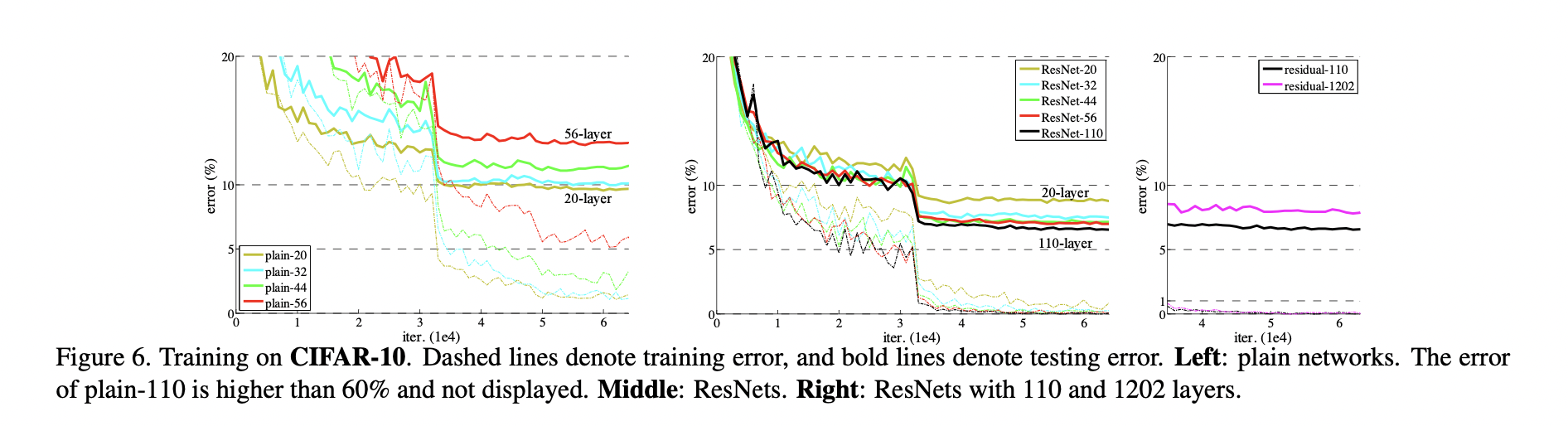 CIFAR-10 데이터셋을 활용해서 다양한 구성의 ResNet 을 실험한 결과, 110 개의 층을 사용한 모델이 가장 성능이 높았고, 1202 개의 층을 사용했을때는 overfitting 이 발생했습니다.