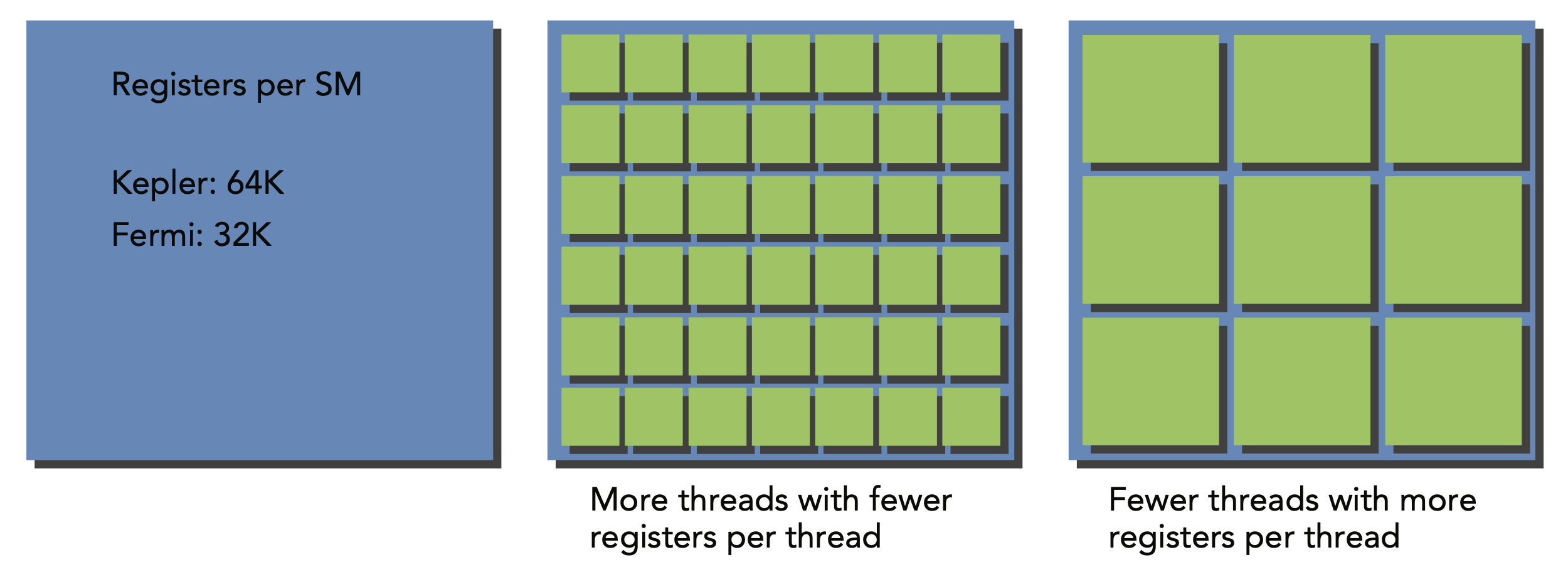 레지스터는 각 스레드에 대해 개인적으로 할당되며, 한 스레드에 할당된 레지스터는 다른 스레드에서 볼 수 없음. 레지스터의 활용은 컴파일러가 결정함.