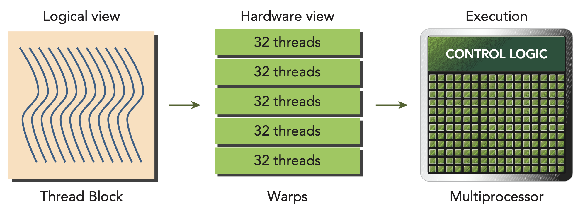 워프는 SM에서 실행되는 기본 단위입니다. 스레드 블록 그리드를 실행하면, 그리드 내의 스레드 블록들이 SM에 분배됩니다. 스레드 블록이 SM에 스케줄링되면, 스레드 블록 내의 스레드들은 워프로 더 세분화됩니다. 워프는 32개의 연속된 스레드로 구성되며, 워프 내의 모든 스레드는 단일 명령 다중 스레드(SIMT) 방식으로 실행됩니다. 즉, 모든 스레드가 동일한 명령을 실행하고, 각 스레드는 자신의 개인 데이터에 대해 해당 연산을 수행합니다. 아래 그림은 스레드 블록의 논리적 관점과 하드웨어 관점 간의 관계를 보여줍니다.