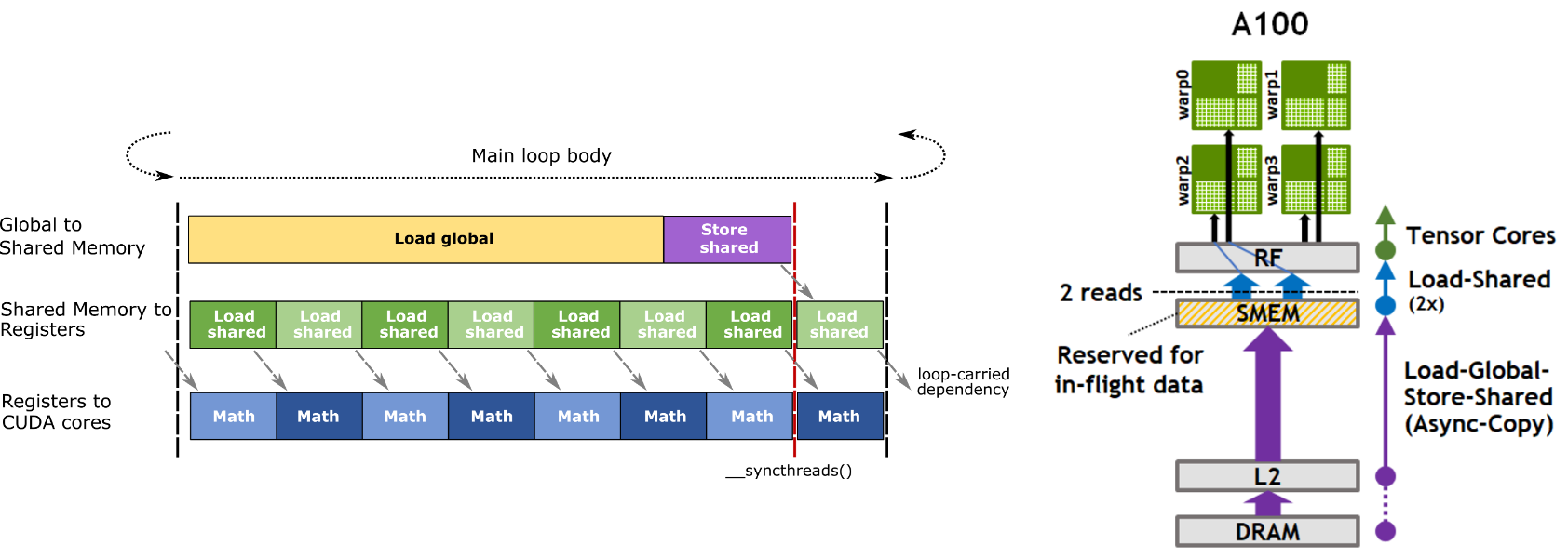 암페어(Ampere) 아키텍처부터 CUDA는 글로벌 메모리에서 공유 메모리로의 비차단 비동기 복사를 지원합니다. 이를 통해 메모리 작업 중 GPU 연산을 동시에 수행할 수 있을 뿐만 아니라 메모리 로드 경로를 DRAM-L2(bypass)-SMEM으로 단축하여 더욱 효율적으로 만듭니다. 이 기능은 DRAM에서 공유 메모리(SRAM)로 데이터를 직접 복사하면서 L2 캐시를 우회할 수 있게 해주어 데이터 전송의 대기 시간을 줄이고 GPU의 처리 효율을 높입니다.